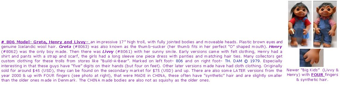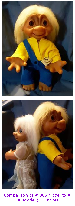 # 800- DAM Store Display “Mega” model– One of the LARGEST DAM trolls ever made, stands an impressive ~20” high, with brown plastic eyes, has moveable head and arms, notice there are only four fingers and four toes. Marked on right foot– 800, on the back of body (below neck)– Made in Denmark Thomas DAM 1977. Outfits were normally a boy with top and pants, but there were a few that had dresses too. These were not intended for re-sale to the general public. Intended to be for store displays only, out stretched hands were meant to hold smaller DAM trolls. There is another body that was used known as the one toe (stocking) version, these used the same head, torso & arms just different legs which made the troll slightly shorter. (~18 in). The legs were grooved and meant to have stockings painted (or worn) these are unmarked. See comparison photos below showing the two versions, photos provided by Cheryl Gafforini and used with permission. It is hard to find these guys for sale, supposedly only a few hundred made, some collectors say ~500 or less. Due to their size some have loose joints (can’t stand on their own or have weak necks). They can sometimes be found on secondary market at a minimum starting price of around $1,000 (USD) & up |