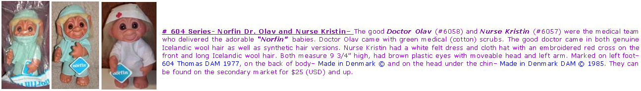 After many years of disappearance in the USA, in the mid 1980’s the E.F.S. Marketing Associates of Farmingdale NY was one of the few USA companies who was granted permission to import DAM trolls (Dam Things Aps) from Denmark back into the U.S.A. Many of these newer DAM’s were re-sold under the registered name of “Adopt-A-Norfin,” they came with distinctive turquoise blue hang-tags. The NORFIN name was registered to the E.F.S Marketing Company (the NORFIN trademark name was- filed on Dec 30, 1982 and cancelled on Jan 22, 2005. For reference/source please refer to U.S. Patent & Trademark website– use TESS search trademark option, basic search/new user, type in NORFIN then click on- SN 73407799). The DAM company itself had nothing to do with implementation of the NORFIN trademark/name.
