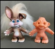 Some folks go even further . . . . I have to admire these Trolls . . . the “punker” troll with his unique Mohawk hair style, imitation leather outfit, camo pants and body piercings definitely speak of a culture that is used to expressing itself. Or even the “centaur” troll made with the lower body of a vintage DAM horse troll whose body suffered from a dog who thought it was a chew toy, you can still see chew marks (or scars) on parts of the lower horse body. This was combined with upper half of a vintage 2.5 inch DAM troll . . . Another troll collector Martin Calderwood enjoys “visual” stories check out his tortoise troll a true reptrollia . . . Or the bee-utiful DAM bumble-bee . . . .