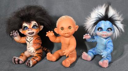 DAM Baby Doll Troll in center with OOAK Tyger Baby (left) and Avatar baby (right) are great examples of the work done to create her OOAK troll make-overs. |