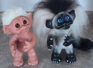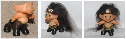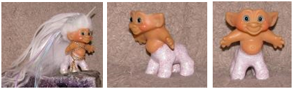 Examples shown on this page are of non-original DAM trolls (OOAK’s) that have been altered. There is a divided view among collectors about altering some of these collectable trolls especially some of the older vintage ones. Still I can’t help but admire some of the unusual versions that have surfaced from these inspired collectors. Sometimes the alteration is just slight like new eyes or hair added that were not factory installed or original to the troll when it was sold. Does this de-value the troll when alterations are made? This question is still debated among collectors. The troll is no longer original (this is TRUE), and perhaps its appearance has been drastically changed or altered from the original version produced by the factory. “Beauty is in the eyes of the beholder . . . “ each collector must decide for their self at some point if they want to have only “original” specimens in their collection or if they are open to having pieces that have been altered. It therefore becomes a personal choice that only YOU can answer . . . There will always be collectors and artists out there, who will cater to your desires and dreams of making a custom One-Of-A-Kind troll that is more personal and dear to your heart and soul that another collector doesn’t have. Some folks (myself included) like having something unique & special that no one else has . . . Hence—- the OOAK’s . . .